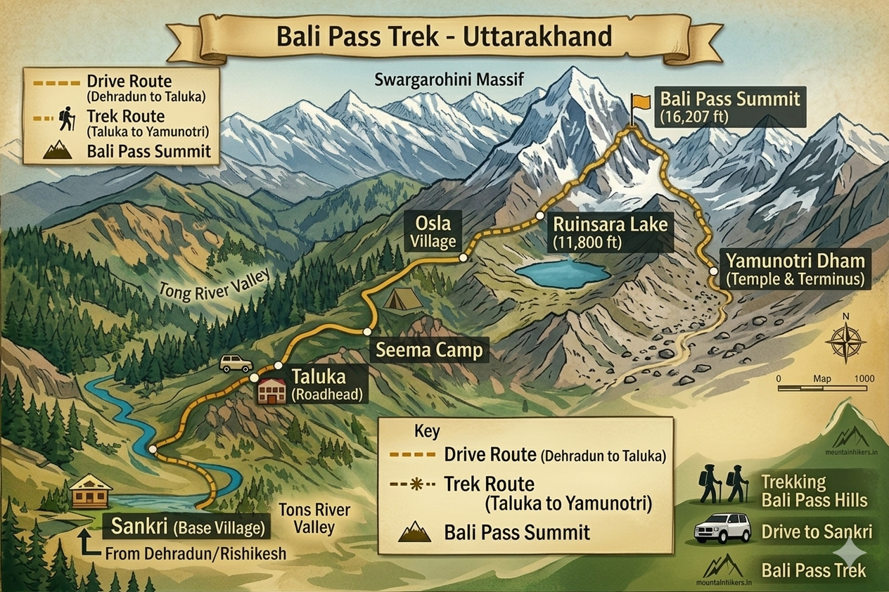 Soon, plants and trees make room for a high-altitude area. The Bali Pass is a very high place at 16,207 ft. From this spot, you can see all around and view the Bandarpoonch, Kalanag, and Swargarohini peaks. Getting this reward is not easy because the journey is tough and is only meant for people who have a lot of experience in trekking.