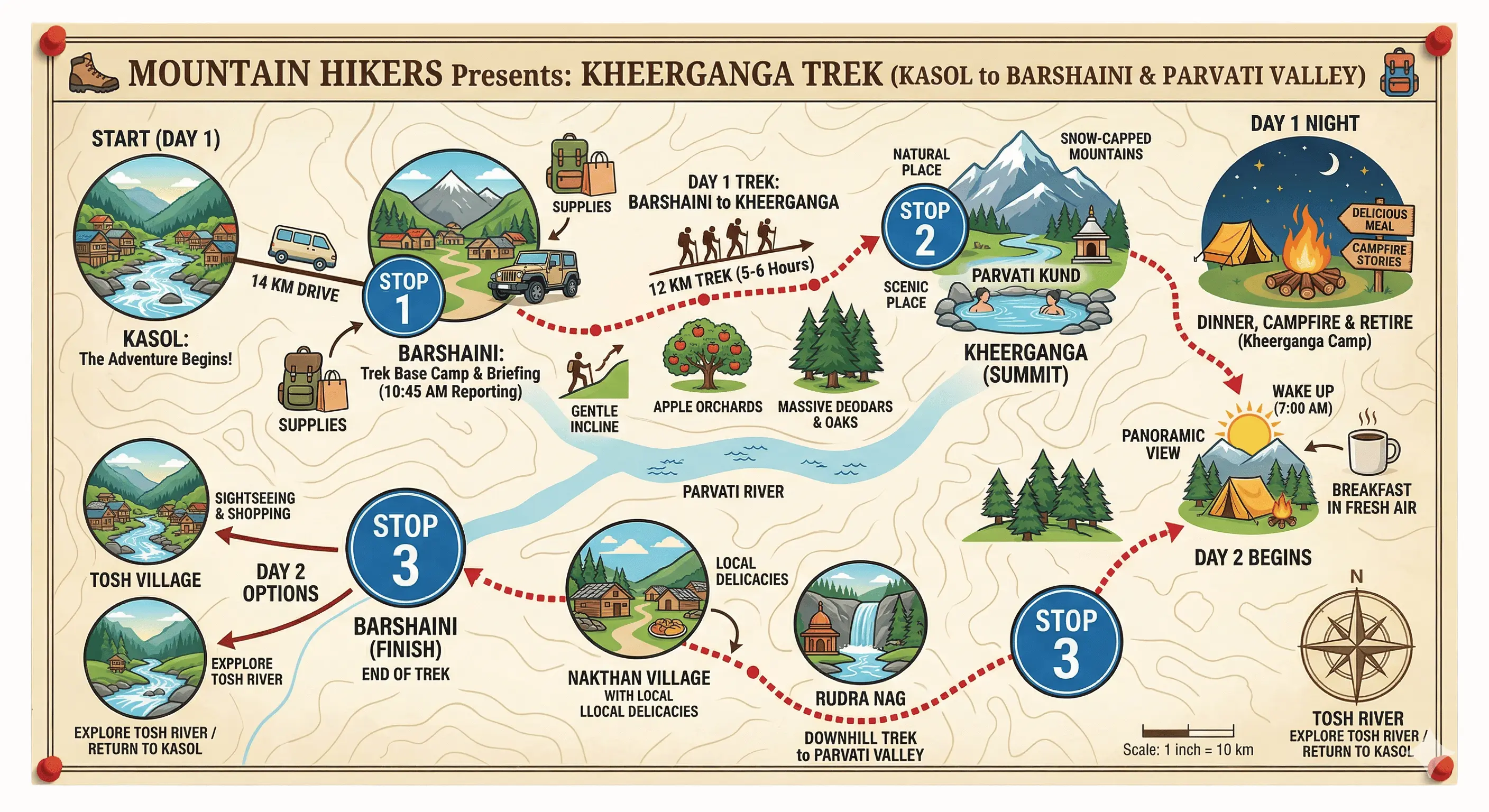 - Embark on a 12-km trek to Kheerganga, which takes approximately 5-6 hours to complete. The trail starts with a gentle incline, passing through picturesque apple orchards. As you progress, you'll find yourself surrounded by towering Deodar and oak trees, adding to the trek’s enchanting beauty.