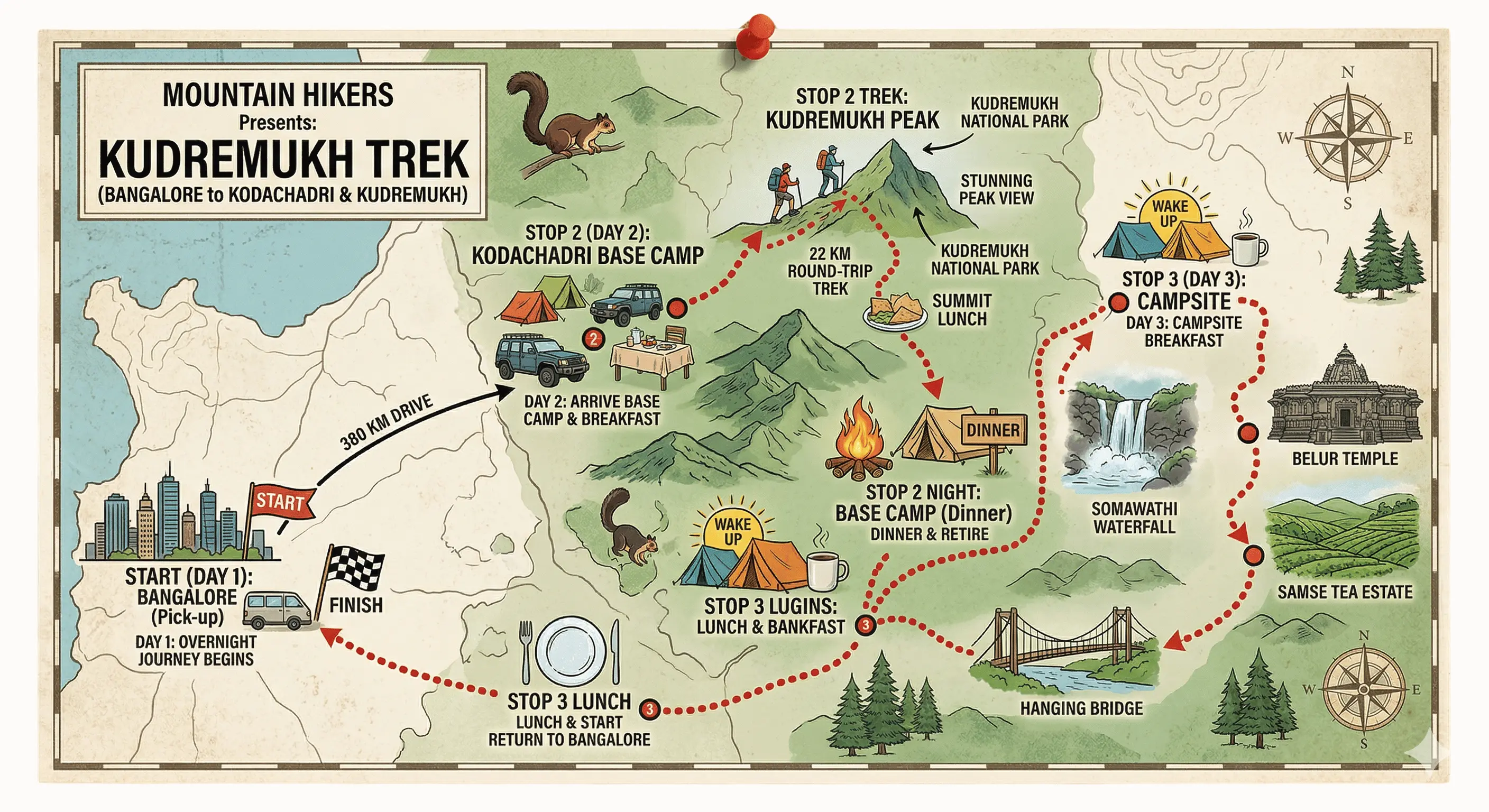 Set in the heart of the Western Ghats, the Kudremukh Trek is a favorite among nature lovers and thrill seekers. Located within the lush Kudremukh National Park, the trail offers endless greenery, misty valleys, and views that never stop giving. At 6,207 feet, Kudremukh is the third-highest peak in Karnataka, and reaching the summit is as rewarding as it is scenic.