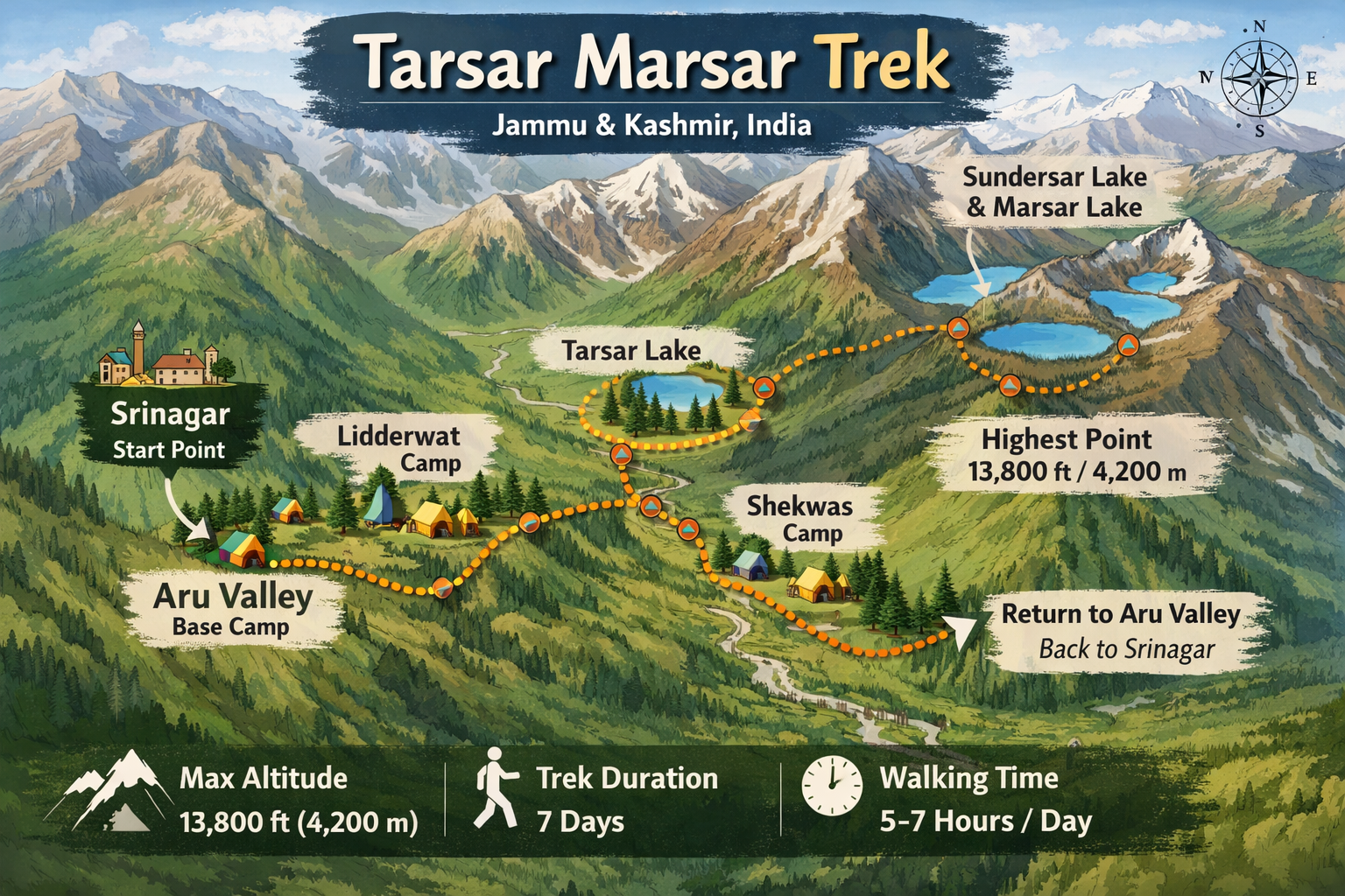 Located in Jammu and Kashmir, the trek usually starts from Aru Valley near Srinagar. Over 7 days, trekkers walk around 45–50 kilometers through pine forests, river crossings, rolling grasslands, and high mountain passes. The maximum altitude reaches around 13,000 feet, making it a moderate difficulty trek suitable for fit beginners and experienced trekkers alike.